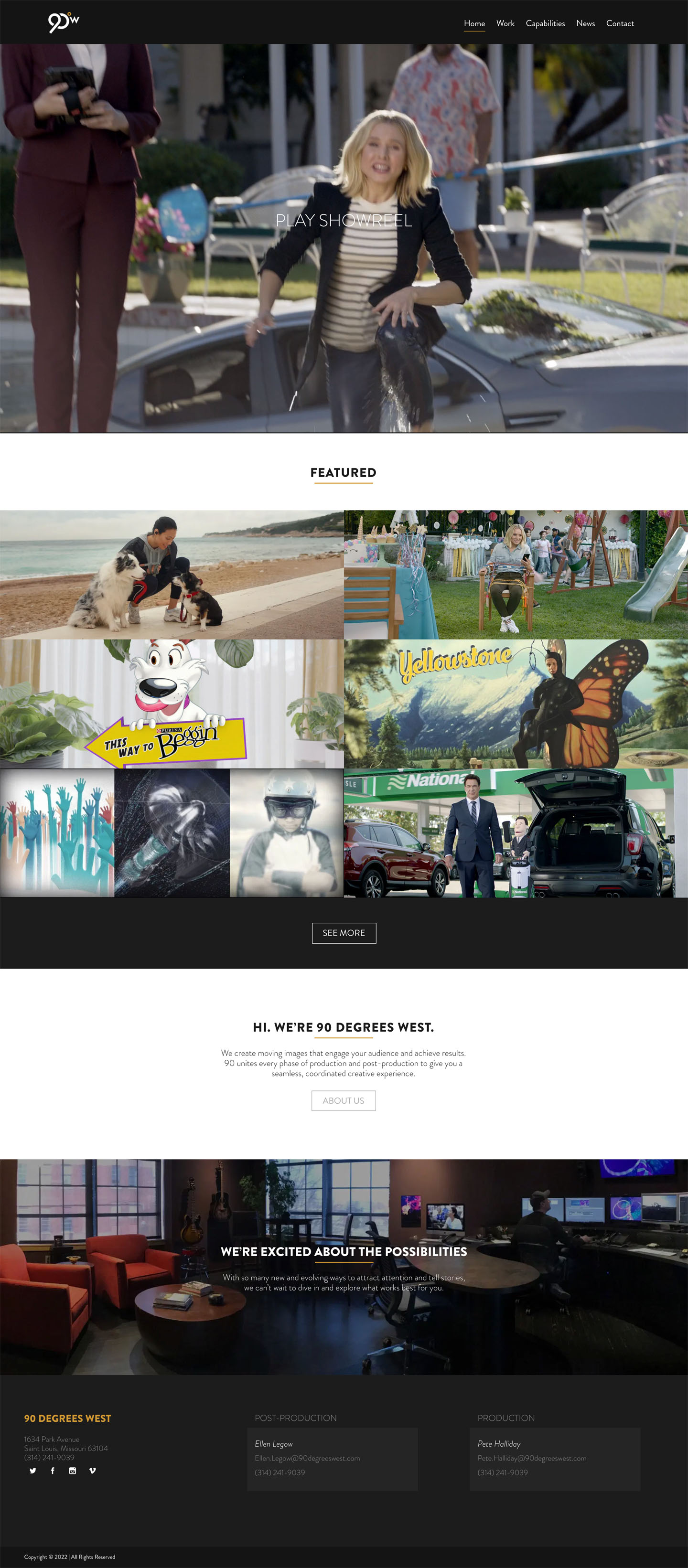90 Degrees West is a video production company with clients like Enterprise, Budweiser, and McDonald's. They had us create a custom website to showcase the quality and scale of their video production capabilities. Site performance and speed were both critically important to this client, as their homepage loads a video compilation of their work.